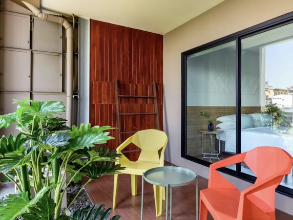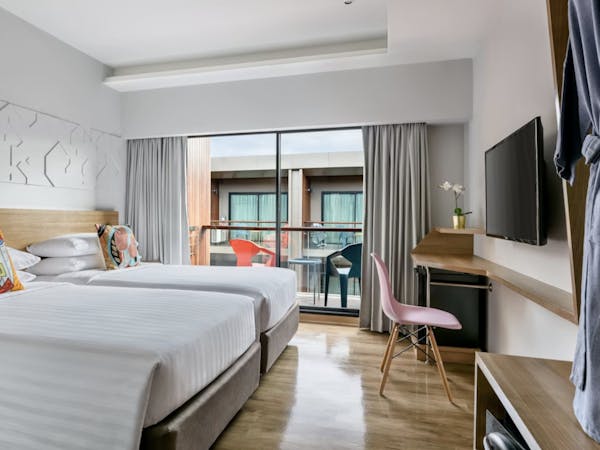 Perfect for friends or travel partners, this room features twin beds and a private balcony — blending cozy comfort with a touch of Bangkok’s urban charm.
