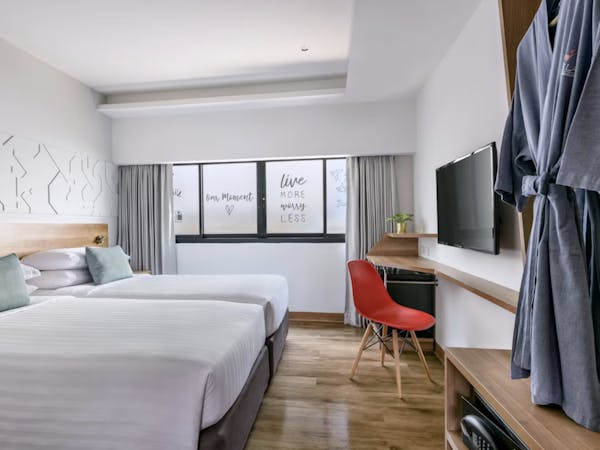 A stylish and functional room with two comfy twin beds — ideal for friends or family who want to explore, recharge, and stay connected in vibrant Ratchathewi.